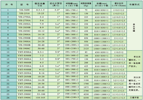 原水硬度:3—10m9-N/L(1mg-N/L=2.8德國度),如原水硬度高于l0mg-N/L.選型時加大一個型號或采用二級軟化。出水口硬度:<0.03mg- N/L.